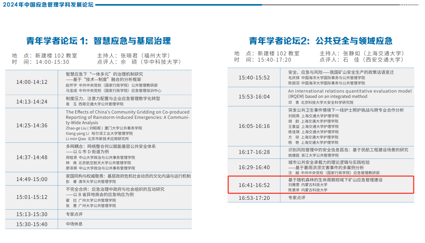 硕士研究生提交了论文《基于随机森林的生命周期视域下矿山应急管理建设》,并在青年学者论坛中以口头报告形式进行了分享与交流。研究立足于矿山应急文化建设,运用随机森林算法技术探究在矿山应急管理建设不同生命周期下应急文化因素所呈现的影响性。