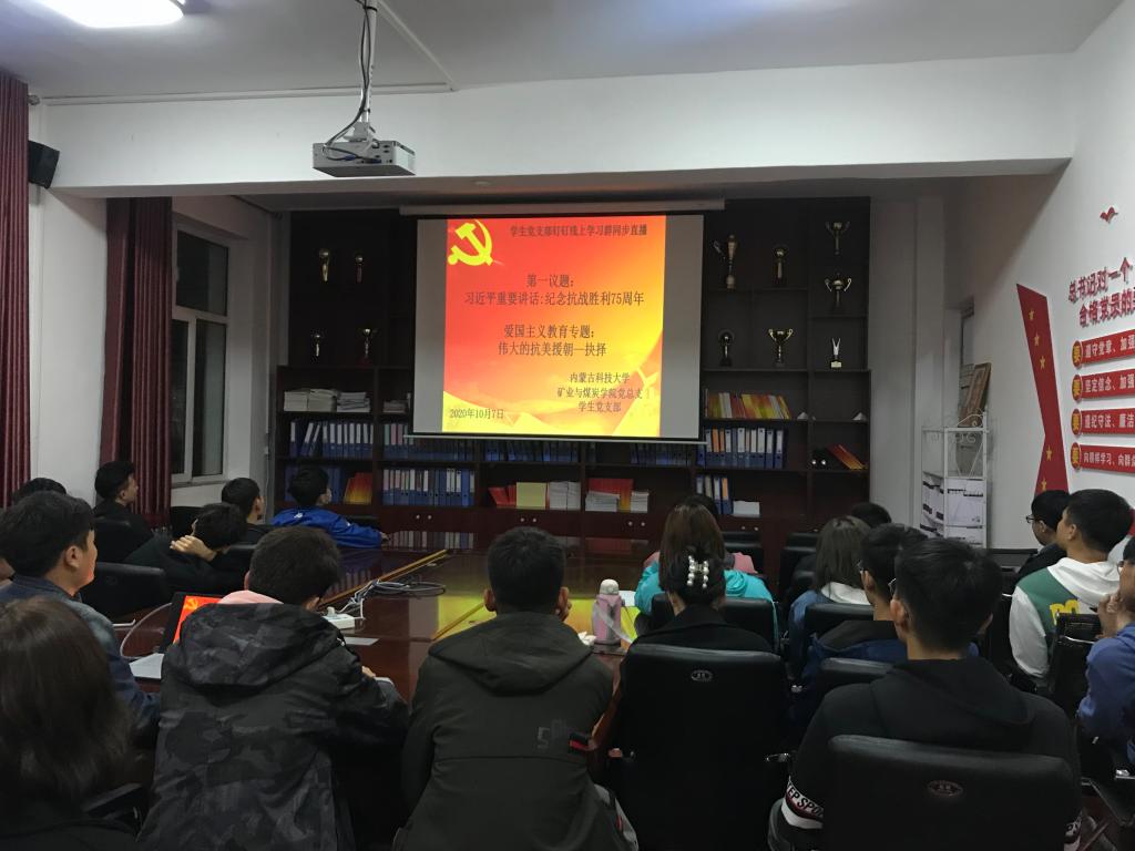 为提高大学生综合素质,学院党总支于2020年10月07日晚19:30,在临曦楼二楼党员之家线上线下同步开展专题理论学习活动。本次学习内容是第一议题:纪念中国人民抗日战争暨世界反法西斯战争胜利75周年座谈会重要讲话;爱国主义教育专题:抗美援朝伟大抉择。
