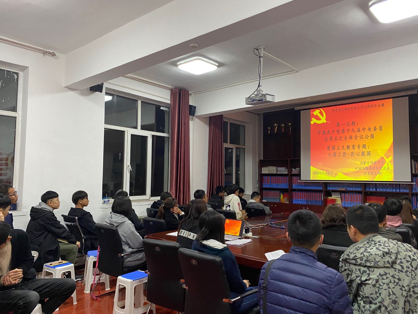 党总支于2020年11月05日晚上19:30,在临曦楼二楼党员之家线上线下同步开展专题理论学习活动。本次学习内容是:第一议题:学习中国共产党第十九届中央委员会第五次全体会议公报;爱国主义教育专题:观看《大国工匠-匠心报国》视频。