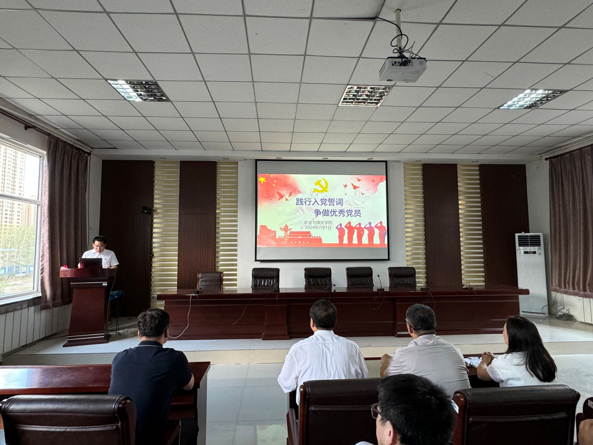 学院党委委员胡显峰带领新党员面向党旗庄严宣誓,其他与会党员重温入党誓词。