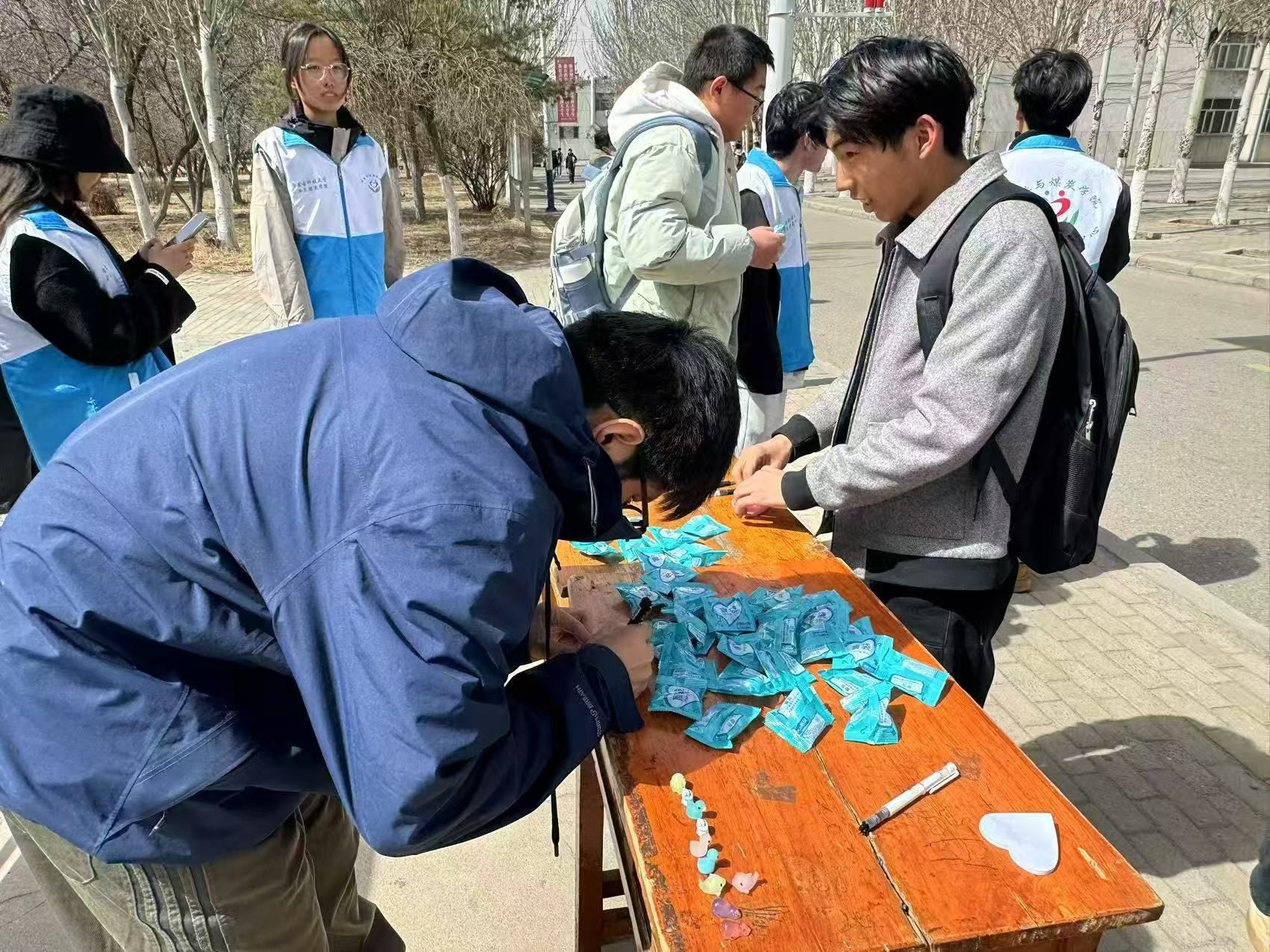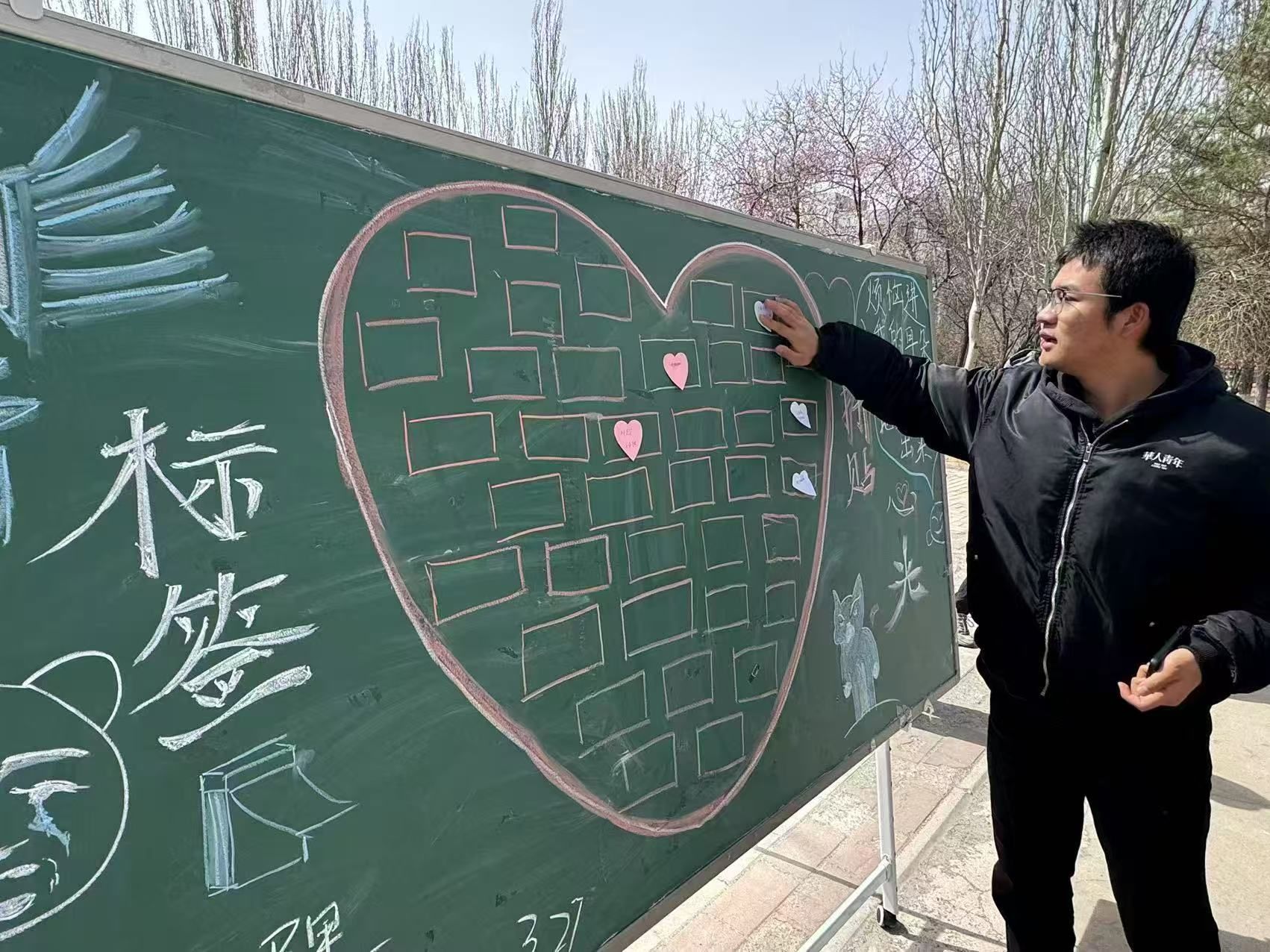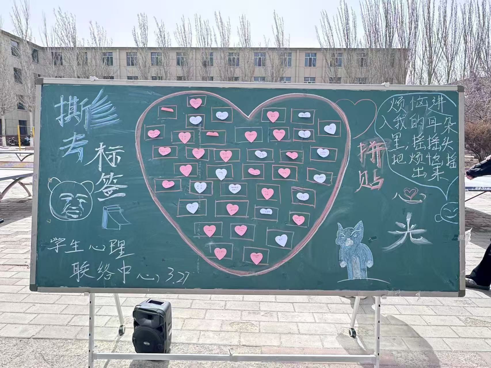 部分同学认真地写下自己的签名,希望能在这场意义非凡的心灵约会中留下专属的深刻印记;有些同学选择与自己书写的标签合影打卡,祈愿未来的自己能够始终秉持自爱之心。一个个标签贴上去组成了一个大爱心,引得路过同学驻足拍摄。
