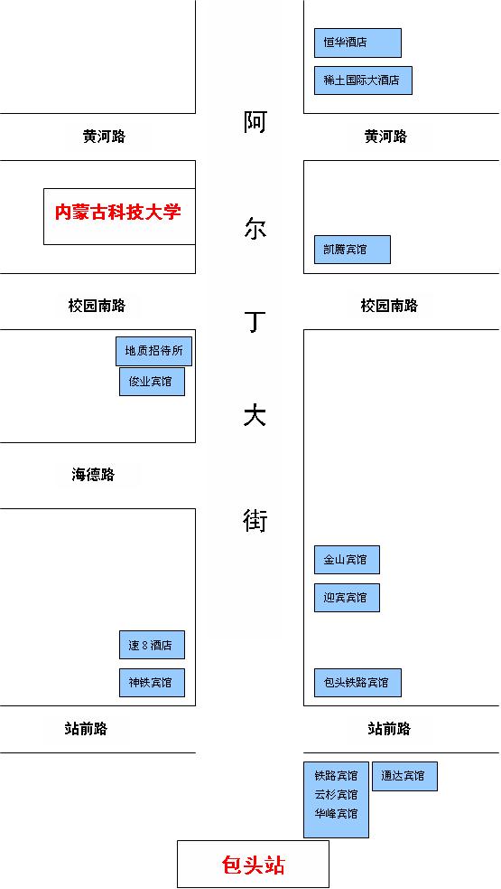 1、本图为91制片厂 周边宾馆(酒店)示意图,仅供我校新生报到期间家长及新生参考使用。2、如图中标示内容临时有变,恕不另行通知。3、图中标示出的宾馆(酒店)食宿条件各异,请新生及家长根据个人情况自行选择。4、我校距离包头火车站仅1.5公里,可乘坐1、2、8、22路等公交车直达。